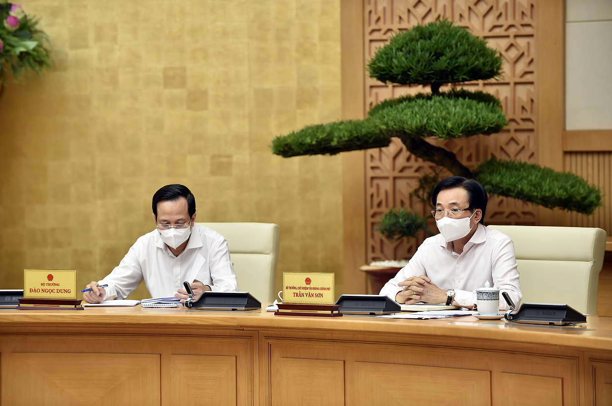 | Bộ trưởng, Chủ nhiệm VPCP Trần Văn Sơn, Bộ trưởng Bộ Lao động-Thương binh và Xã hội Đào Ngọc Dung tham dự cuộc họp. Ảnh: VGP/Nhật Bắc |